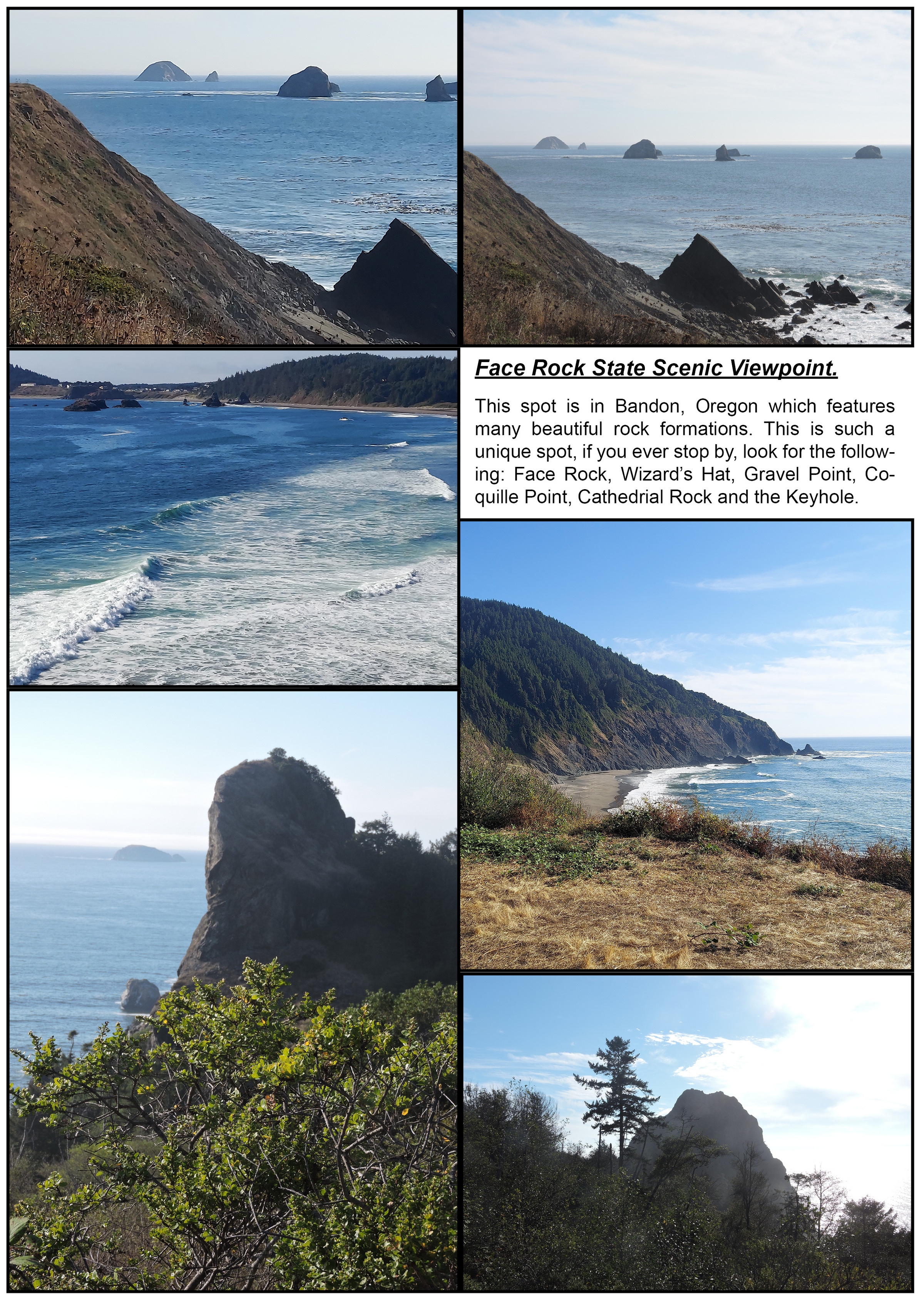 Driving from Florence to Gold Beach I stopped at the Face Rock State Park and drove down the Beach Loop Road, just west of U.S. 101 to photograph its numerous rocky spires, offshore rock formations, and sandy beaches, with tide pools as well as an abundant number of sea birds and mammals. The Beach Loop Road offers access at several viewpoints. This five-mile drive/tour can take just a few minutes, or you can make it an all-day outing.